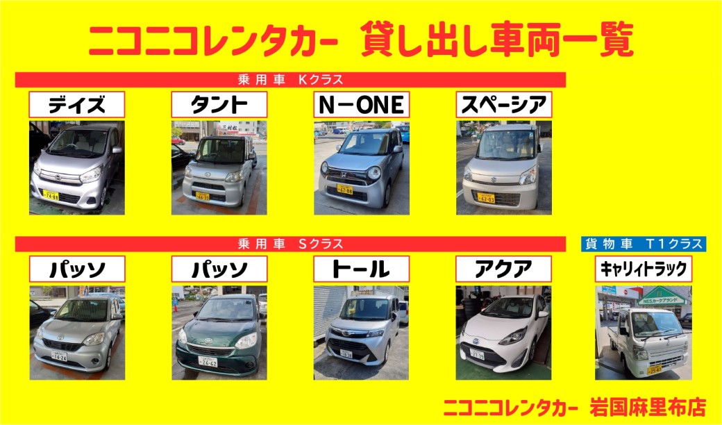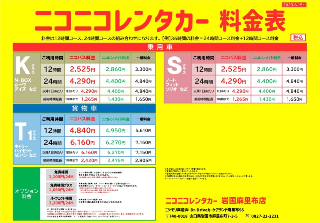 カーケアランド麻里布店にてご利用可能な「ニコニコレンタカー」の料金表です!
